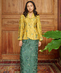 Crafted from a blend of rayon, viscose, and linen with a soft chiffon-blend lining, the kebaya features a folded neckline and puff sleeves finished with elastic cuffs. The matching skirt is designed with a side zip and buckle fastening, complemented by an elasticated waistband for a comfortable and composed fit.