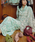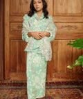 Crafted from a blend of rayon, viscose, and linen with a soft chiffon-blend lining, the kebaya features a folded neckline and puff sleeves finished with elastic cuffs. The matching skirt is designed with a side zip and buckle fastening, complemented by an elasticated waistband for a comfortable and composed fit.
