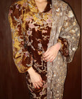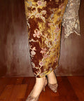 Crafted in printed velvet with a soft chiffon-blend lining, the kebaya features a folded neckline and softly puffed sleeves finished with elastic cuffs. The matching skirt is completed with a zip and buckle fastening, an elasticated waistband, and a soft pink lining that subtly lifts the floral print.