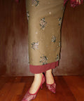 Crafted from printed cotton for the top and cotton with beading for the skirt, with a soft chiffon-blend lining, the kebaya features a folded neckline and puff sleeves that add gentle volume. The skirt is finished with a side zip and buckle fastening, an elastic waistband for comfort, and a burgundy weighted cotton trim at the hem for added texture and visual interest.