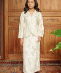 Crafted from a blend of rayon, viscose, and linen with a soft chiffon-blend lining, the kebaya features a sharp neckline and puff sleeves finished with elastic cuffs. The matching skirt is designed with a side zip and buckle fastening, complemented by an elasticated waistband for a comfortable and composed fit.