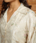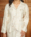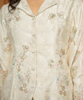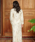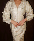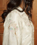This piece carries a quiet refinement for festive occasions. Its thoughtfully structured silhouette allows the delicate pink, blue and green beadings and soft colour of ivory to take centre stage.