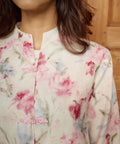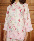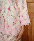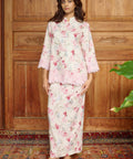 Crafted from printed cotton linen with a chiffon-blend lining, it features a mandarin collar neckline with a button-up kebaya front finished with frog knot buttons. Lace trimmings detail the sleeves and bottom hem of the top, adding subtle texture. The matching skirt comes with a zip and buckle fastening, complemented by an elastic waistband for comfort.